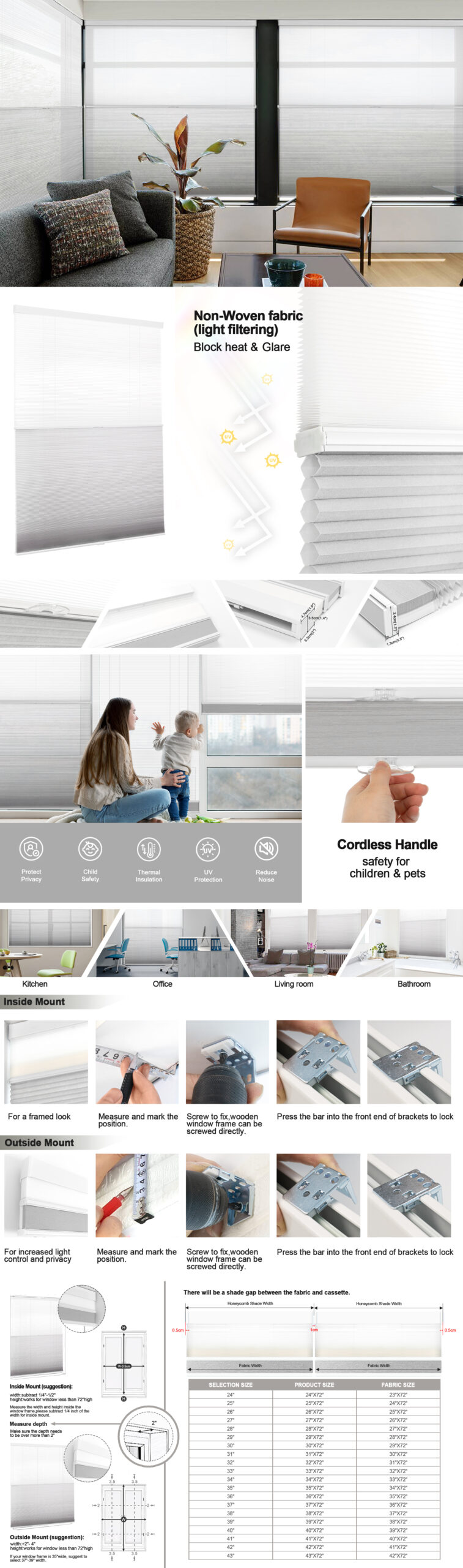 - Fabric Functions: blinds made with both sheer part and light filtering no-woven fabric