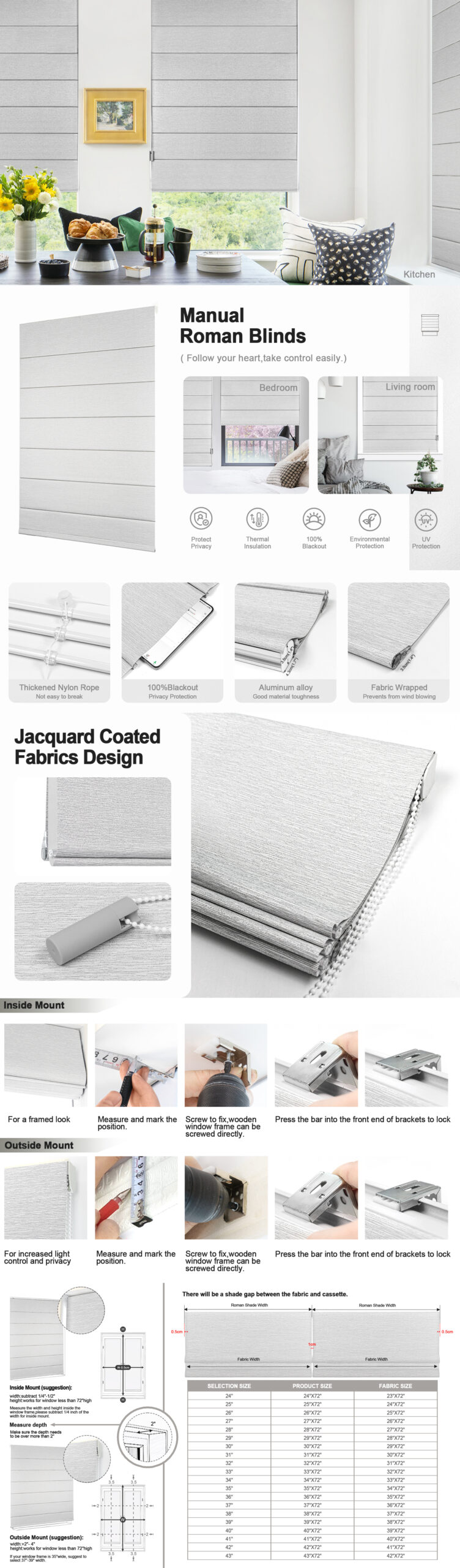 - Order Size:For inside mount, if your window is 34″ width, order a 34″ shade or slightly smaller, window depth >2″. The window shade height can be adjusted from 0″ to 79″.(Please Note):The fabric width will be 1″ narrower than the total shade size.
