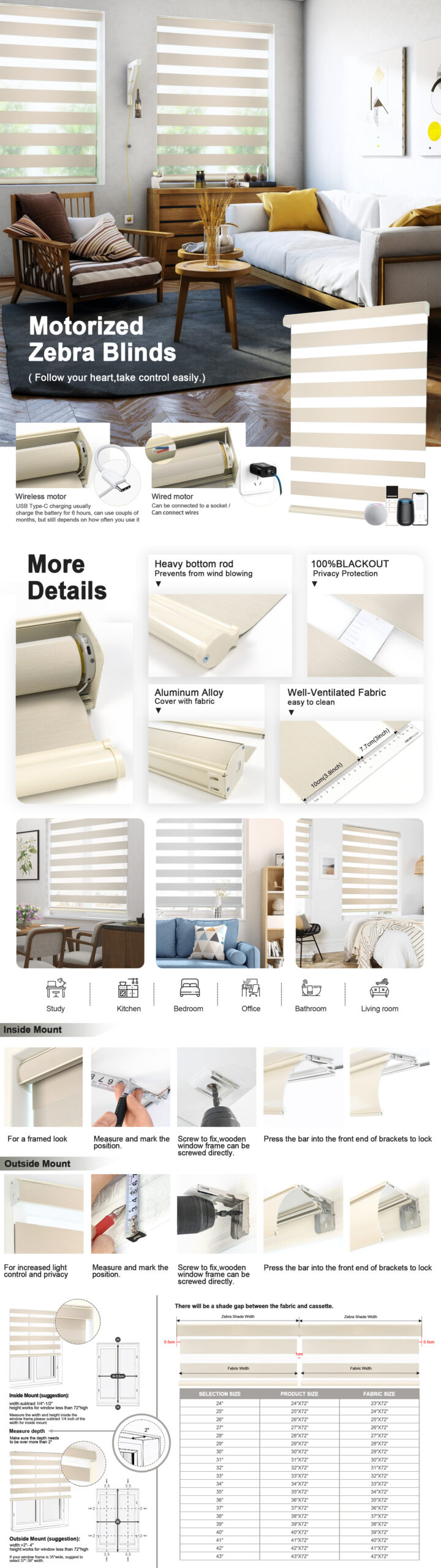 - Fabric Functions: Our zebra roller shades made of 100% polyester fabric, 10cm fabric and 7cm sheer part, blackout fabric can block sunshine and make room darkening